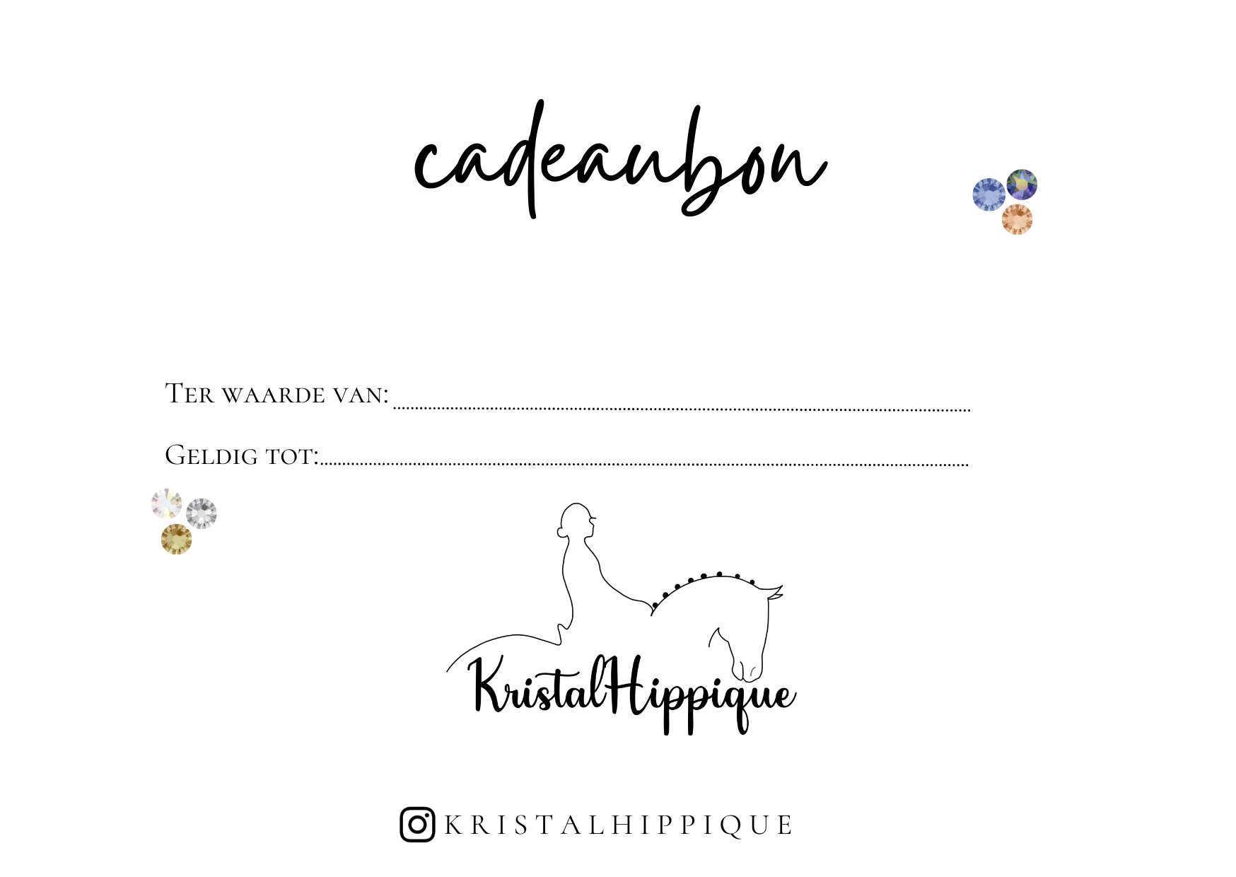 Met de Kristalhippique Cadeaubon geef je iemand de mogelijkheid om te kiezen uit onze zorgvuldig handgemaakte frontriemen en accessoires.