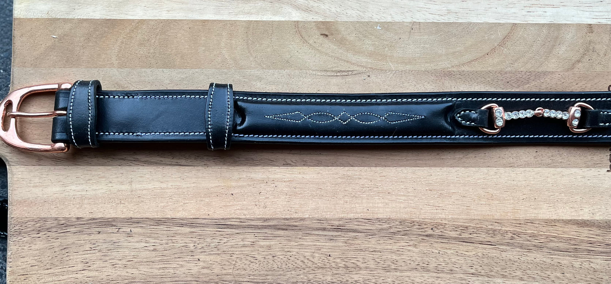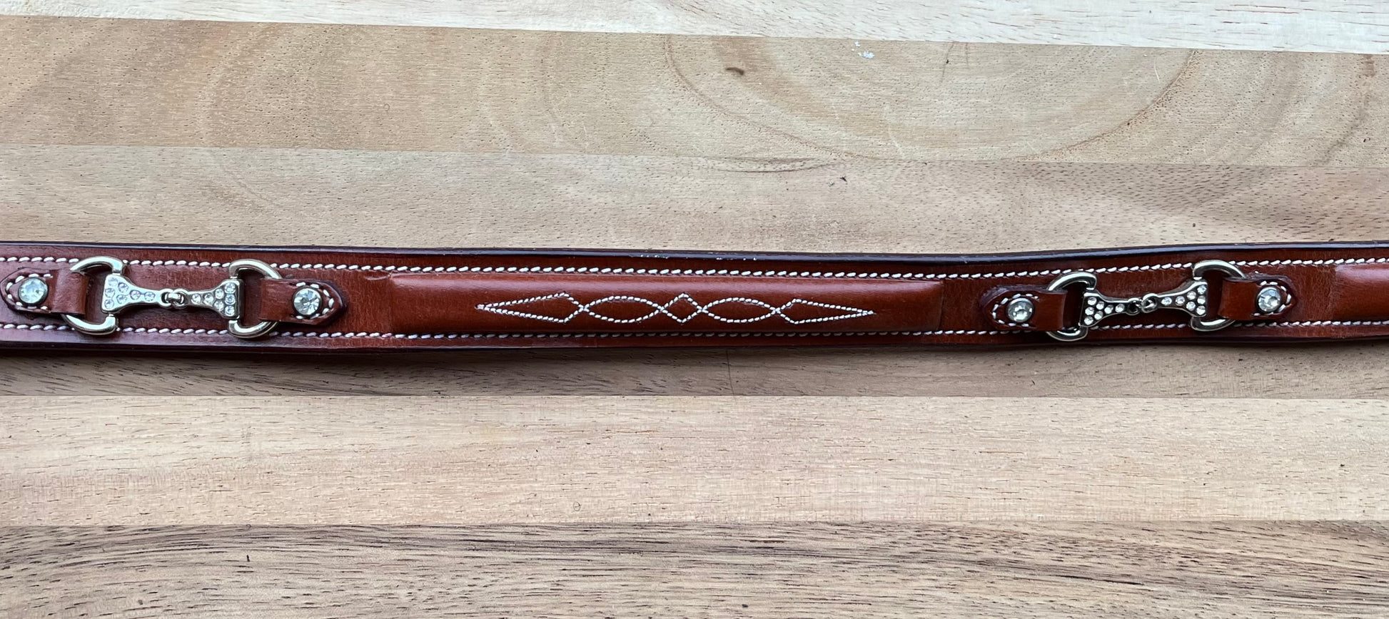 Leren riem versiert met twee bitjes en strass stenen op de leren bevestigingen. De riem is afgewerkt met wit stiksel en voorzien van een zilveren gesp.